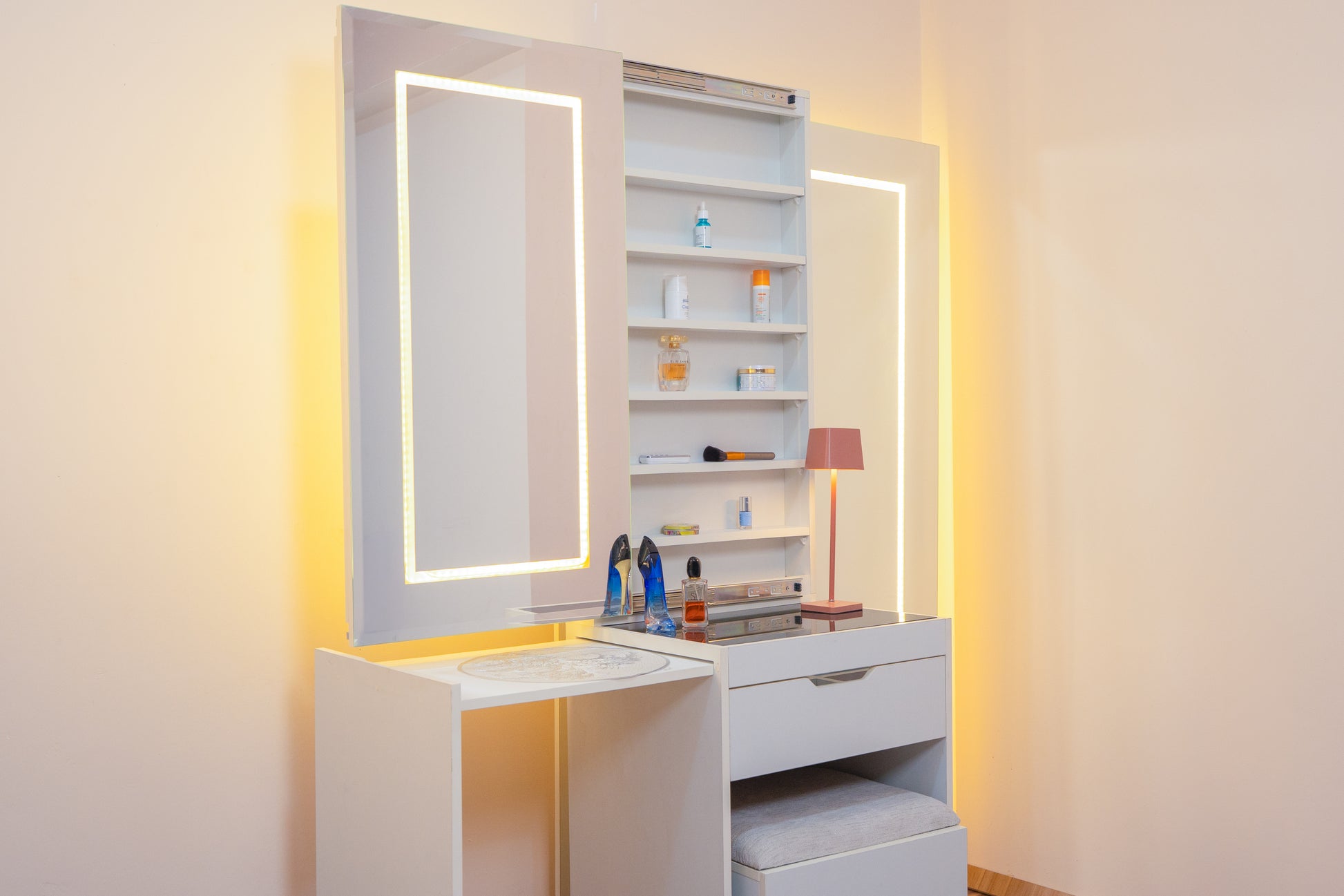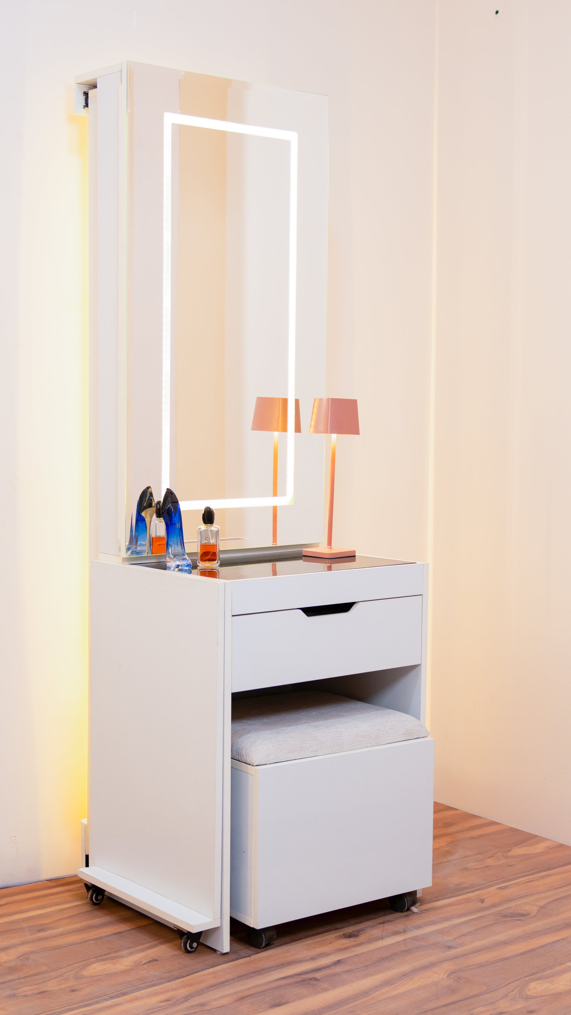 The SmartGlam Studio is the ultimate all-in-one dressing table designed for modern, organized beauty routines. This tall vanity features a built-in chair that tucks seamlessly underneath, and a tabletop that expands to offer extra space for makeup, hair tools, or accessories. The centerpiece is a lighted mirror for flawless visibility, while an expandable full-length mirror adds even more flexibility. At the back, a hidden storage compartment with shelves offers generous space for beauty essentials, and a smooth pull-out drawer adds extra storage for smaller items. With sleek design and space-saving features, SmartGlam Studio blends elegance, innovation, and function in one brilliant setup.