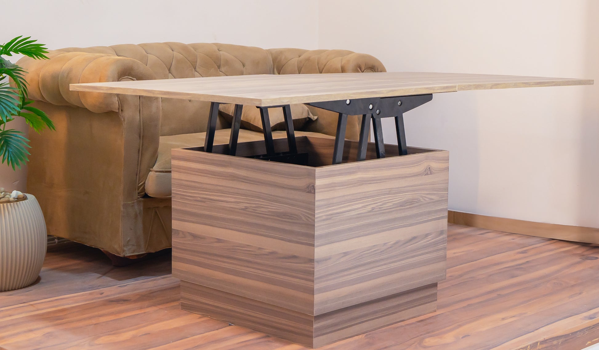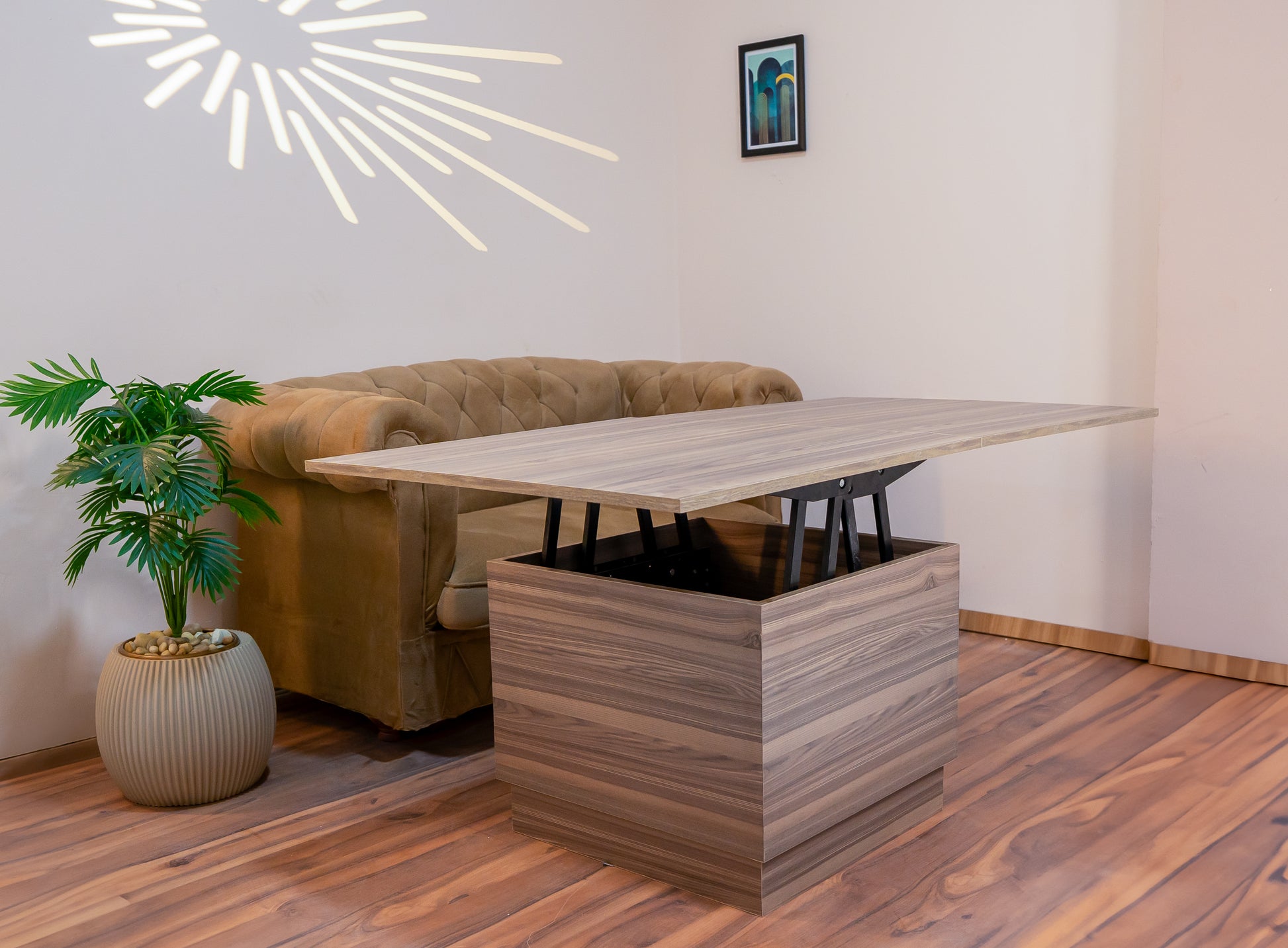 A very chic coffee table that transforms into a large dining table that gathers the whole family.