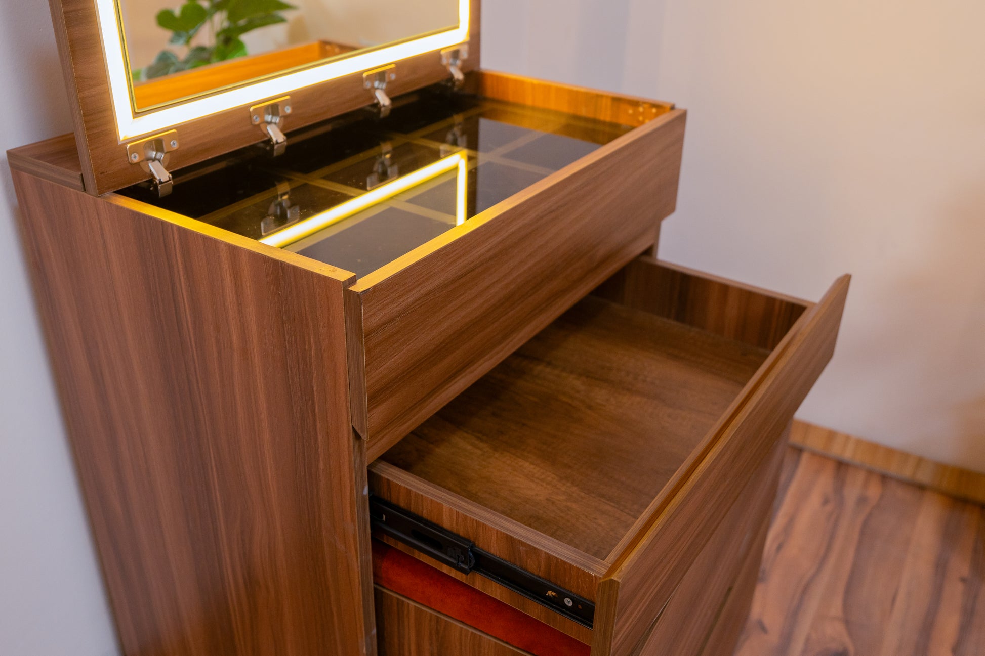 Elevate your daily routine with this multifunctional vanity set, thoughtfully designed for modern living. Crafted from high-quality wood with a warm, natural finish, this space-saving piece features a flip-top mirror, three smooth-gliding drawers for organizing your beauty essentials, and a matching cushioned stool that doubles as additional storage. The stool, equipped with smooth-rolling casters, offers easy mobility and tucks neatly under the vanity when not in use. Perfect for compact spaces, this vanity set combines style, functionality, and smart storage in one elegant solution.
