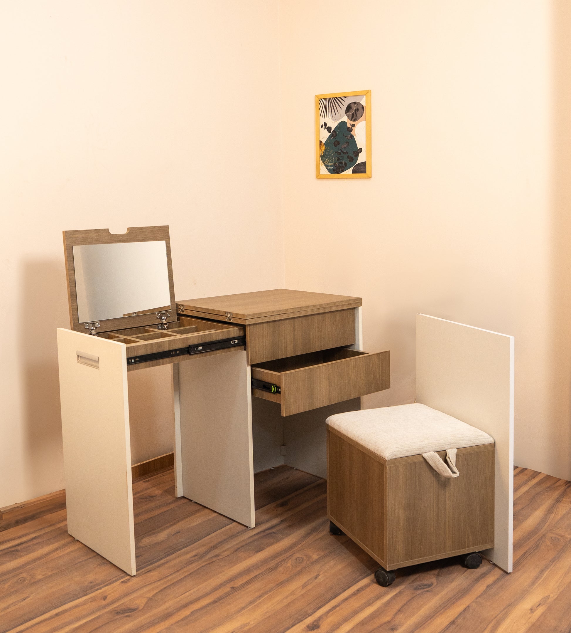 Extends into a vanity or desk with a length of 110 cm and height of 80 cm